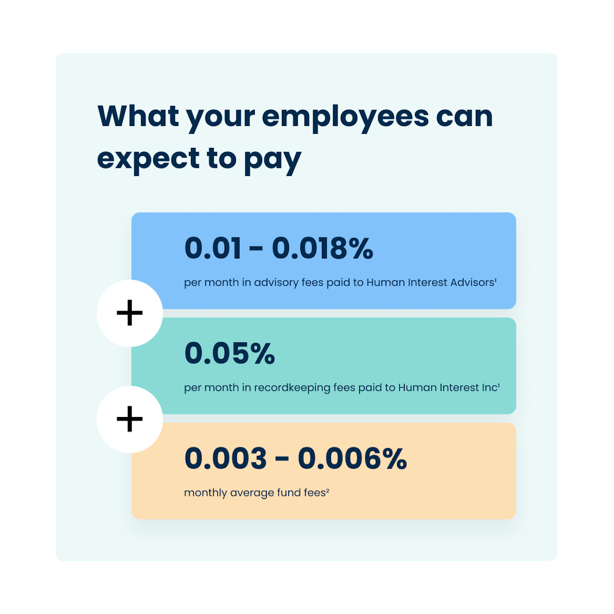 A one-time setup fee of $499 may apply. An investment advisory fee paid to Human Interest Advisors (HIA) of 0.01% of plan assets and a separate fee for recordkeeping services and custody-related expenses paid to Human Interest Inc. (HII) of 0.05% of plan assets are deducted monthly from the employee's account according to the HII and HIA Terms of Service. All prices are exclusive of applicable taxes. If the plan sponsor elects to hire an external investment advisor, the plan sponsor will pay such advisor as agreed between the plan sponsor and advisor. See Retirement Plans Startup Costs Tax Credit for more information on tax credits.