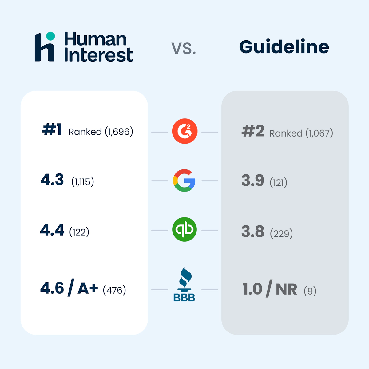 1. The displayed ratings are current as of 8/15/25 and reflect Human Interest scores from Better Business Bureau (4.6/A+), Google (4.3), QuickBooks (4.4), and G2 (4.3), alongside Guideline's scores from Better Business Bureau (1.0/NR), Google (3.9), QuickBooks (3.8), and G2 (4.5). Ratings fluctuate in real-time. Ratings are primarily based on client testimonials, which are unique to individual experiences and may not represent typical results. Past success does not guarantee future performance. Human Interest actively solicited reviews across these platforms and offered nominal non-cash compensation. Human Interest offered nominal cash compensation (gift cards) for reviews on G2 (3/3/25-3/28/25), with a higher value for non-anonymous testimonials. While BBB reviews were solicited, no compensation was provided. Solicitation and compensation can influence reviews favorably. BBB ratings are determined by factors beyond customer reviews. For detailed methodologies and full disclosures, please see our full disclosures.