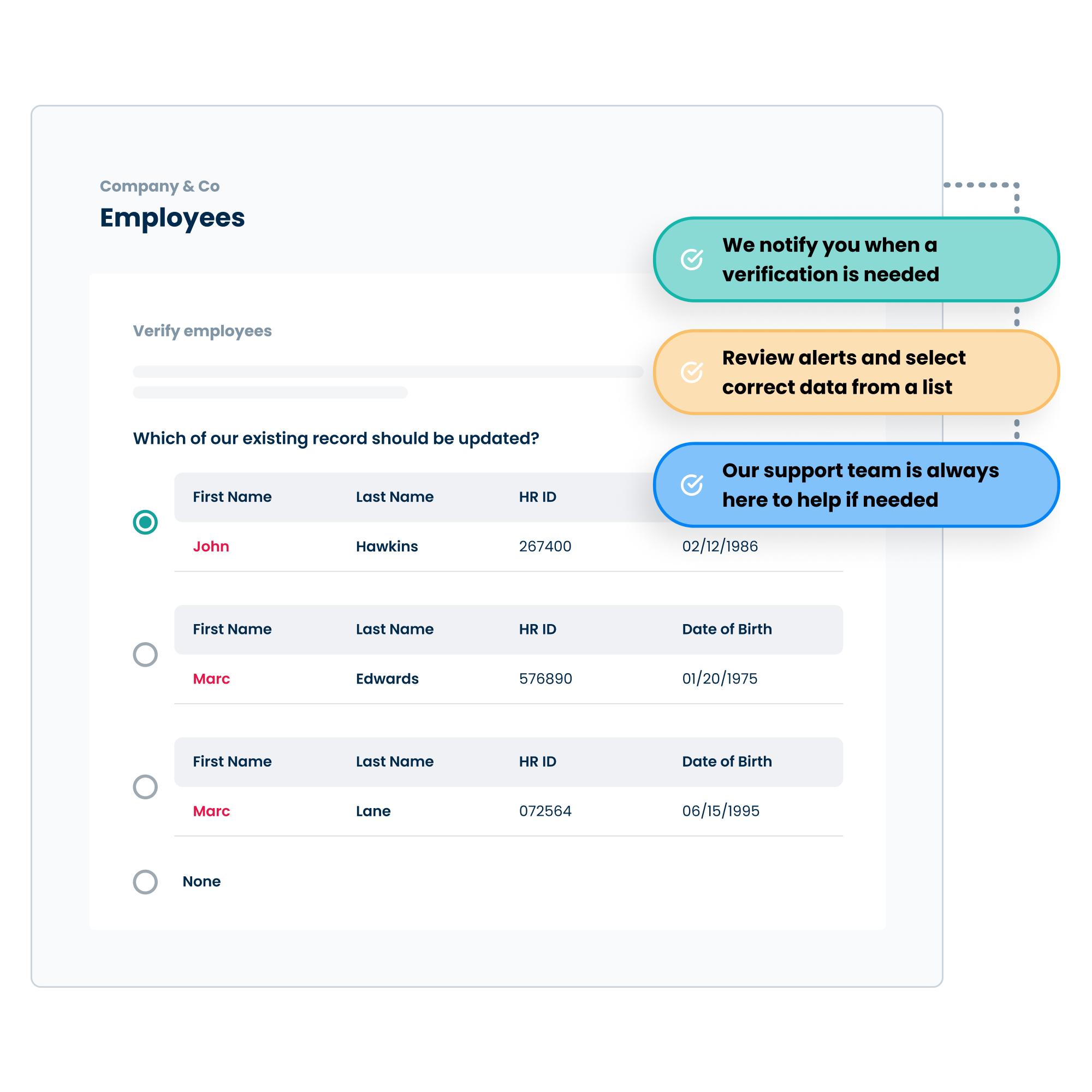 We review employee data against existing records and provide real-time notifications if there are any conflicts or missing data.