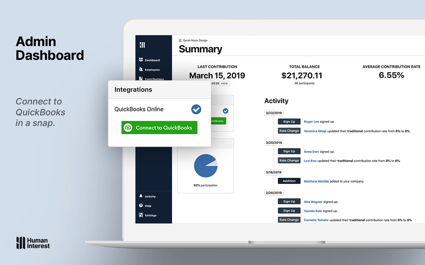 We’re thrilled to announce our brand new integration with QuickBooks Online! If you’ve been considering a retirement solution for your small business or startup, now is the perfect time to check out Human Interest. With our new connection, it’s easier than ever to automate the administration of your plan. If your company uses QuickBooks Online (QBO) to manage its finances and payroll, you’re now able to administer a 401(k) more seamlessly than ever thanks to our new App Store listing. Below, you’ll find answers to some frequently asked questions, details about the integration, and how you can get up and running in no time.
