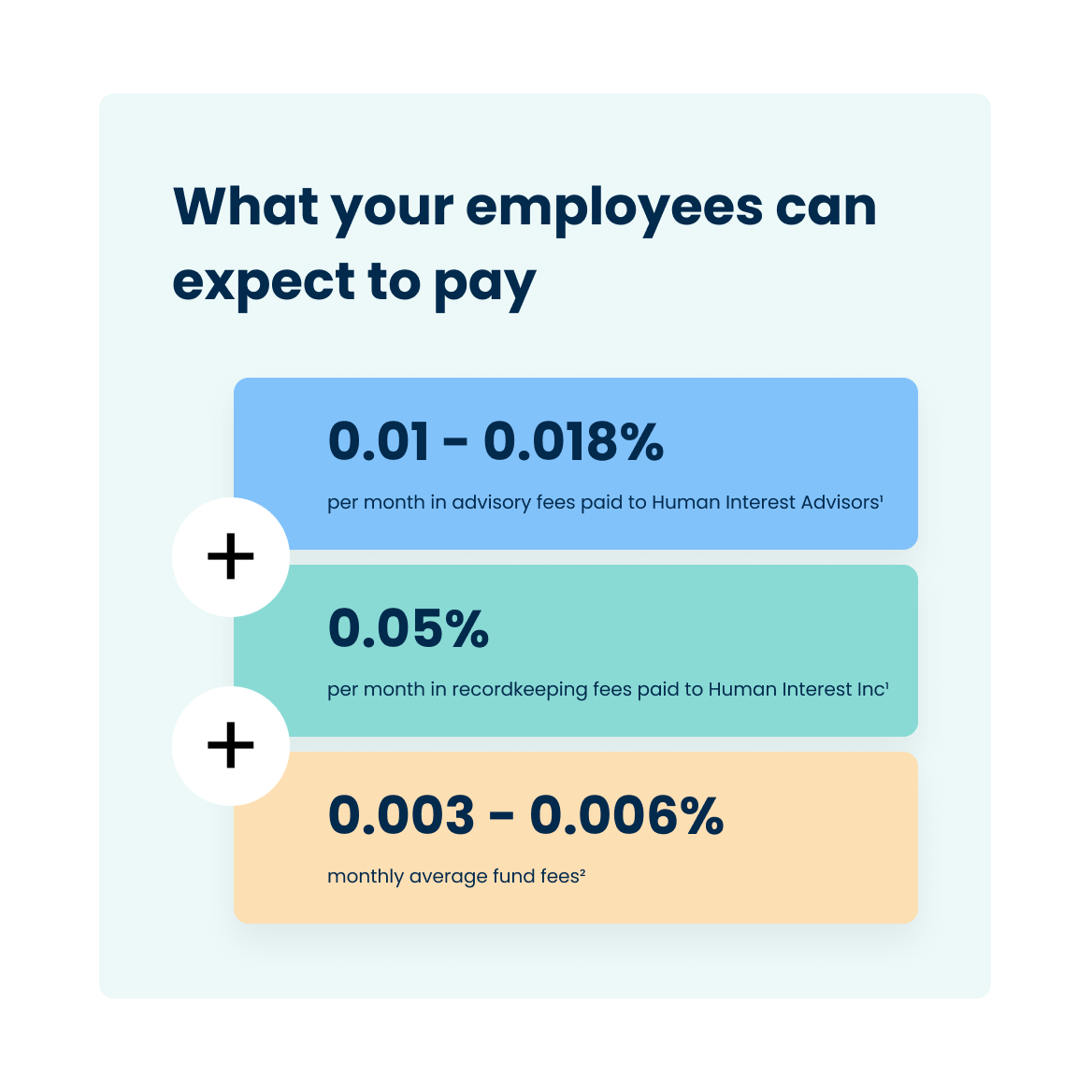 A one-time setup fee of $499 may apply. An investment advisory fee paid to Human Interest Advisors (HIA) of 0.01% of plan assets and a separate fee for recordkeeping services and custody-related expenses paid to Human Interest Inc. (HII) of 0.05% of plan assets are deducted monthly from the employee's account according to the HII and HIA Terms of Service. All prices are exclusive of applicable taxes. If the plan sponsor elects to hire an external investment advisor, the plan sponsor will pay such advisor as agreed between the plan sponsor and advisor. See Retirement Plans Startup Costs Tax Credit for more information on tax credits.