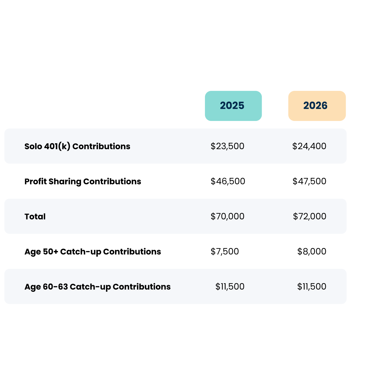 Note: Contributions are limited to $72,000 for 2026. This means if you take the full $24,500 for the elective deferral, you are limited to making $50,000 in employer profit-sharing contributions.1